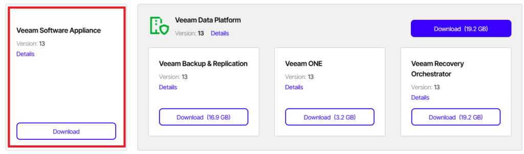 The first step is quite simple: log in to the Veeam homepage and download the appropriate file. When you go to the download page in your profile, just scroll down a little and look for the Veeam Software Appliance. In this guide, I´ll show the OVA file way of the installation.