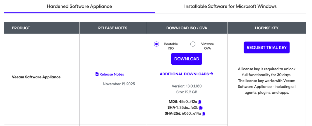 Back on the first download page, you will find the download link for the Veeam Backup & Replication Console at the bottom. You will probably need this later on, as not all functions are available in the new web UI yet. I also downloaded the Veeam Infrastructure Appliance here, which I will need later for the hardened repo.