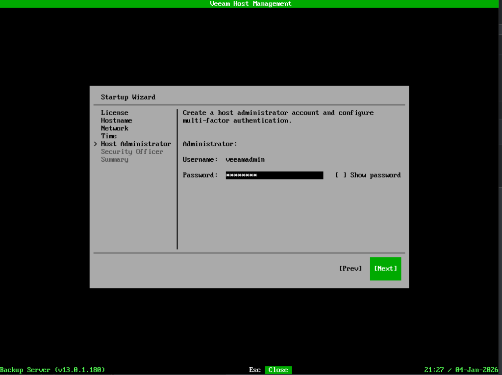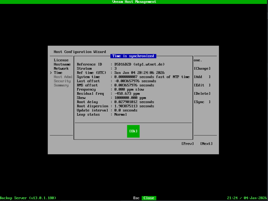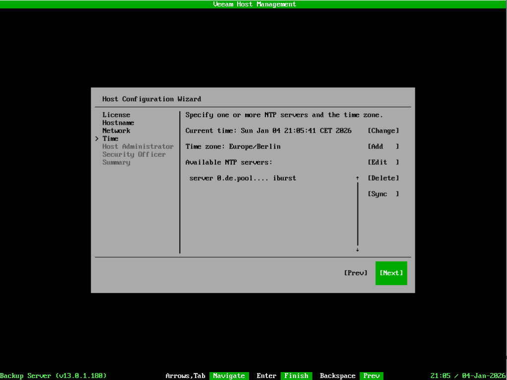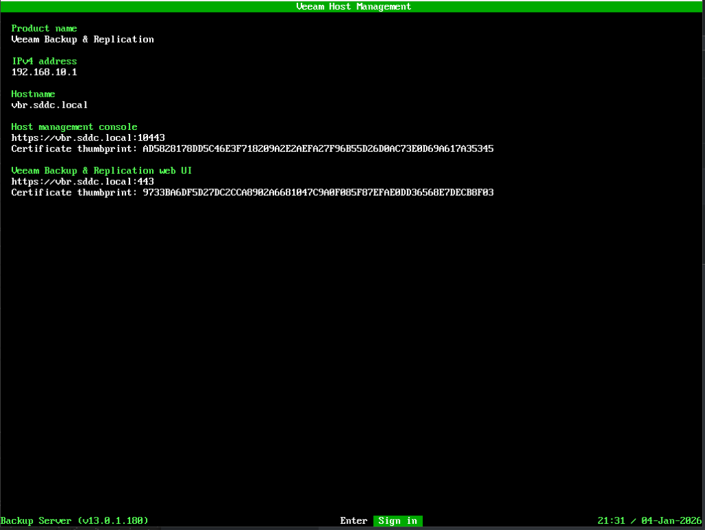 The Veeam Host Management Console can be found at https://<vbr hostname>:10443. This can be used, for example, to change the network and time server settings, but also to install updates, create support bundles, and manage local users.