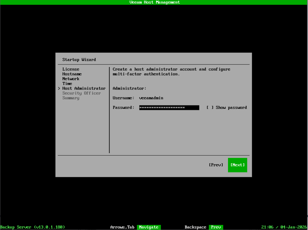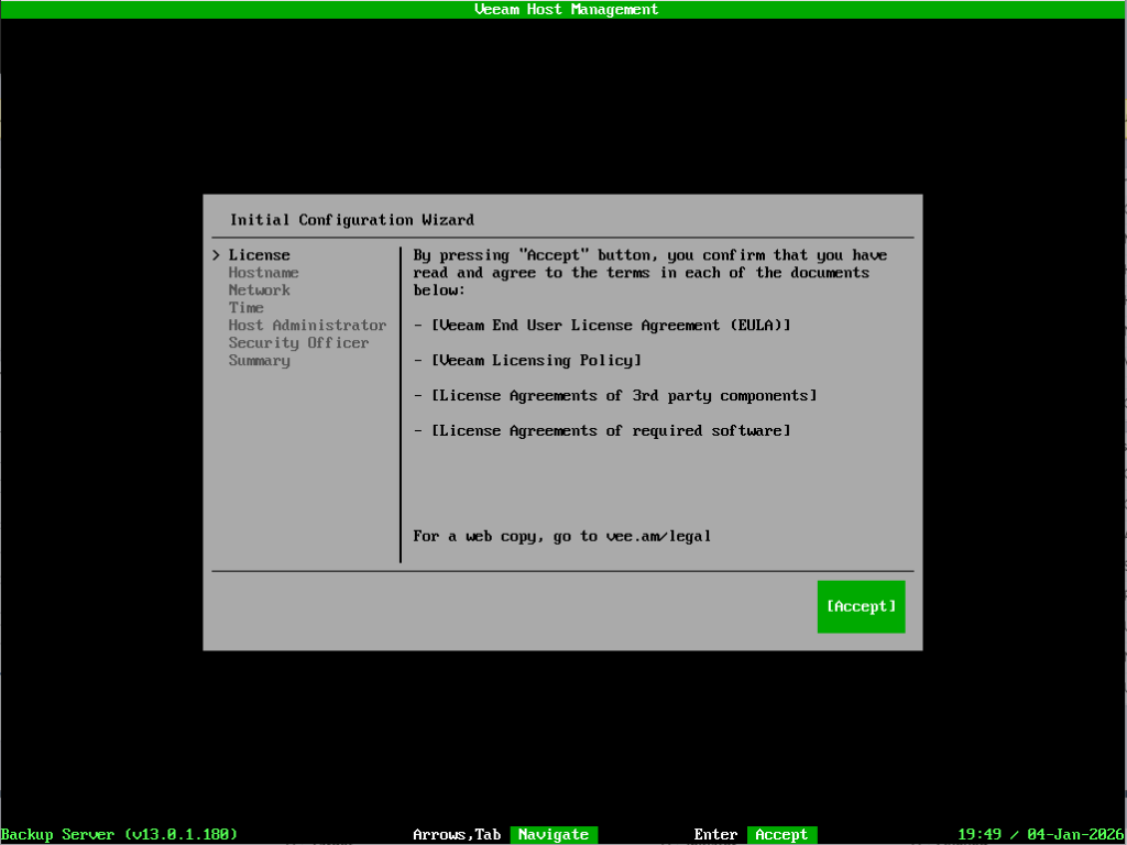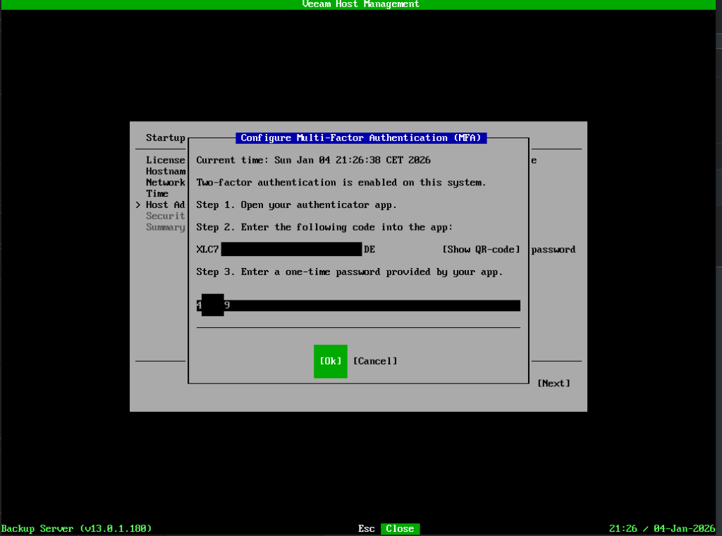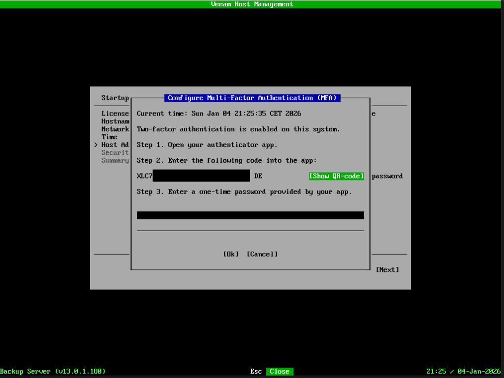 The Veeam Host Management Console can be found at https://<vbr hostname>:10443. This can be used, for example, to change the network and time server settings, but also to install updates, create support bundles, and manage local users.