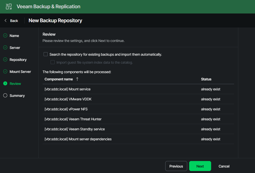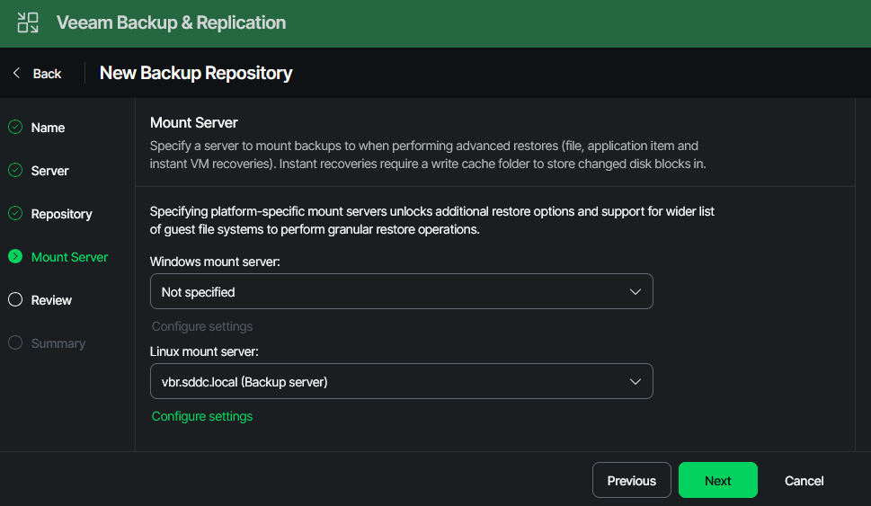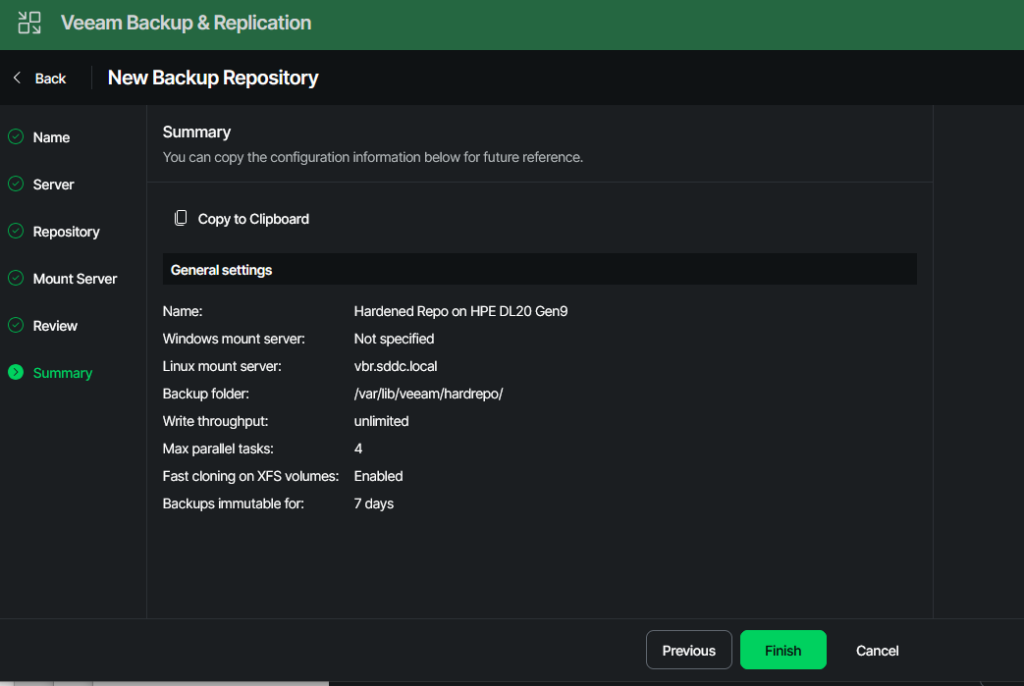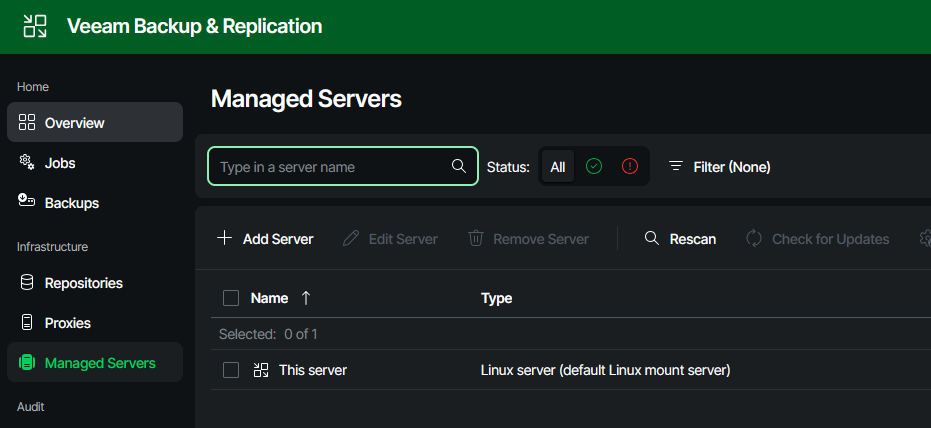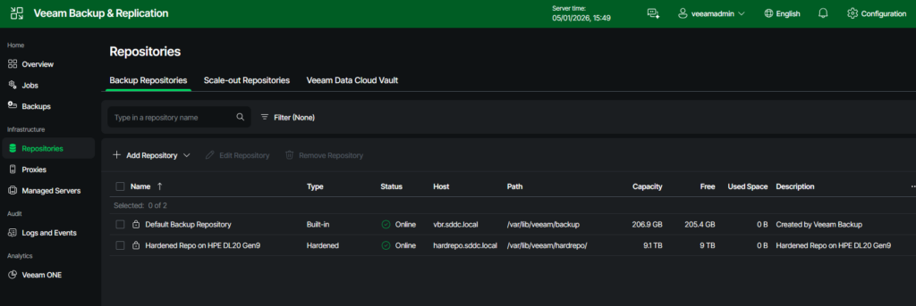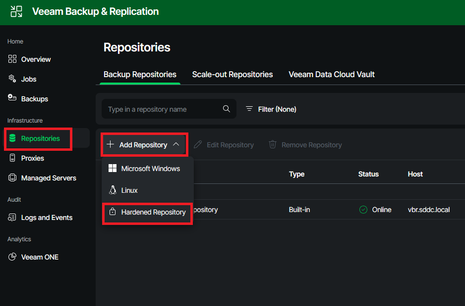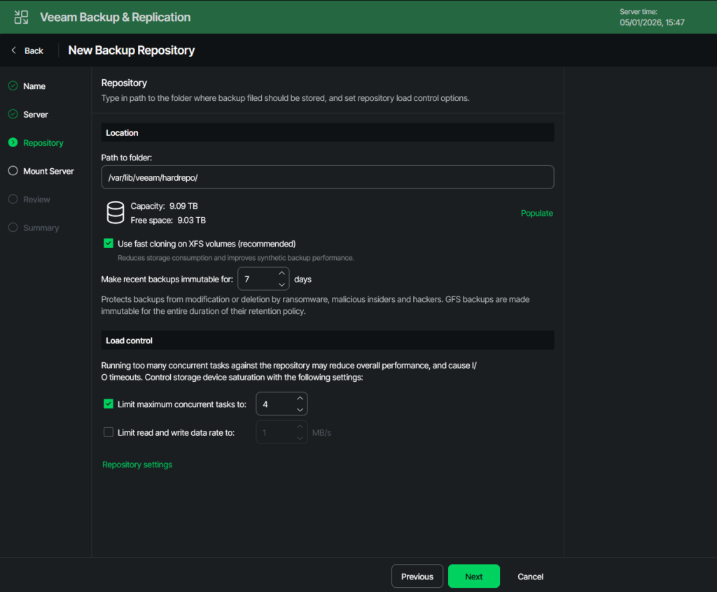 In order to create the hardened repo in your VBR appliance, two steps need to be done. First, the newly installed server is added to VBR as a managed server. Then, the actual repository is created, and all properties such as concurrency and immutability are configured.