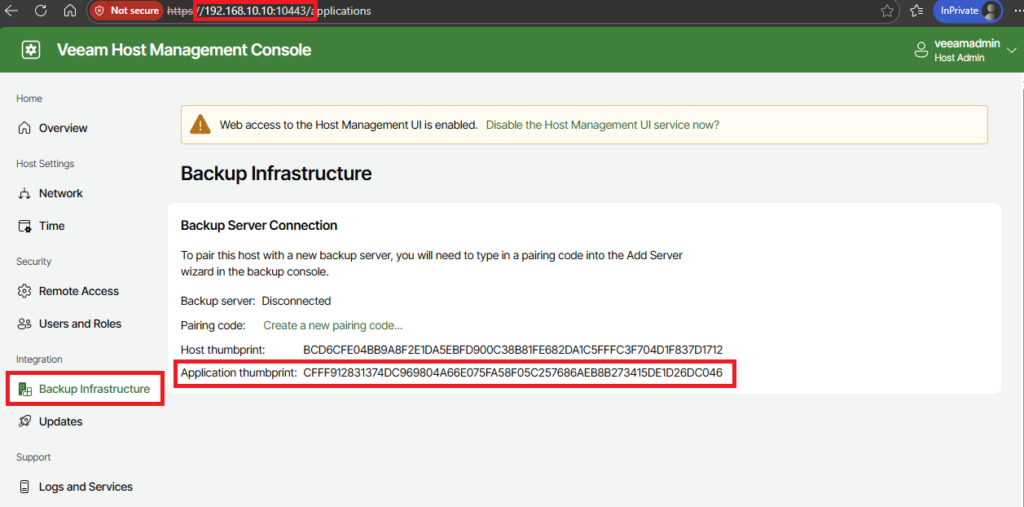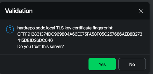 Now you have two choices: the easy and simple one, just click “Yes” and go on. Or you take one minute of your time, connect to the host management console web interface of your repo server, head down to “Backup Infrastructure” and verify the fingerprint.
