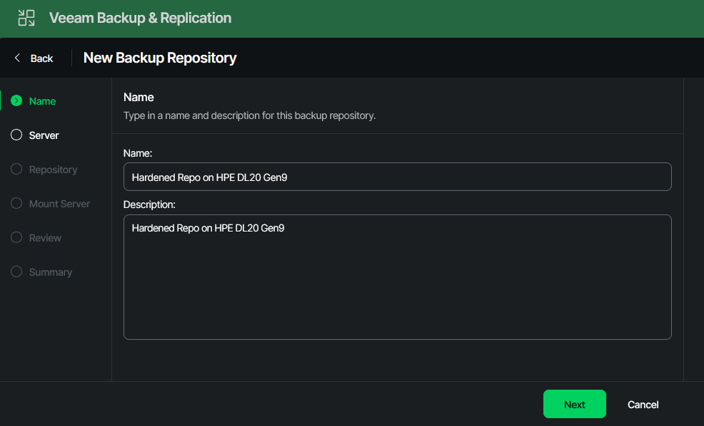 First, enter the path to your data folder. This is where all backup files will be stored. The second disk is mounted under “/var/lib/veeam.” Choose a name and add it to this prefix. I went with “/var/lib/veeam/hardrepo/”.